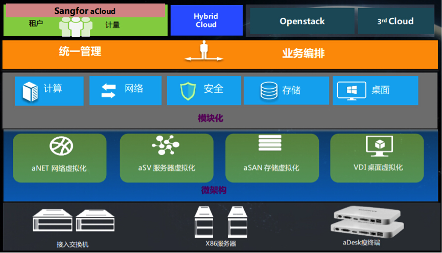 深信服將聚焦虛擬化與云計算領域,圍繞數據中心混合云的發展趨勢,在企業級云數據中心市場實現戰略布局。從底層硬件架構的一體機到超融合虛擬化層、VDI以及上層aCloud的云管理平臺,提供從產品到架構再到平臺的完整云解決方案。這意味著用戶現階段無論是實現虛擬化改造、軟件定義的轉型,還是直接構建屬于自己的私有云,深信服都可以交付與之匹配的完整解決方案。