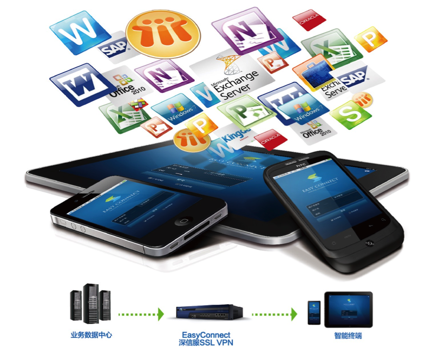 2011年,深信服正式進軍虛擬化市場,順應Gartner提出的BYOD的概念,在國內率先發布了應用虛擬化產品EasyConnect。EasyConnect 遠程應用發布方案能夠幫助用戶在任何時間、任意地點使用任何終端便捷地進行辦公。它采用虛擬化技術直接將后端服務器上運行的業務系統遠程發布到移動終端上,在使用過程中EasyConnect杜絕把業務數據拷貝到設備上,以防發生數據泄密,全面保障業務訪問的安全性。